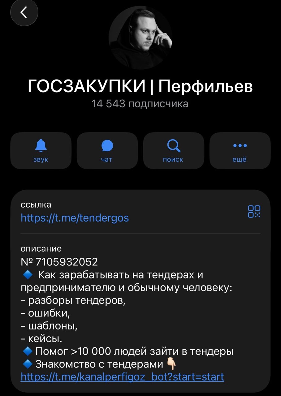 Телеграм-канал Tendergos он же «Госзакупки Перфильев» имеет в 2 раза меньше подписчиков – чуть больше 13 000. Но ведется совсем по другой стратегии.