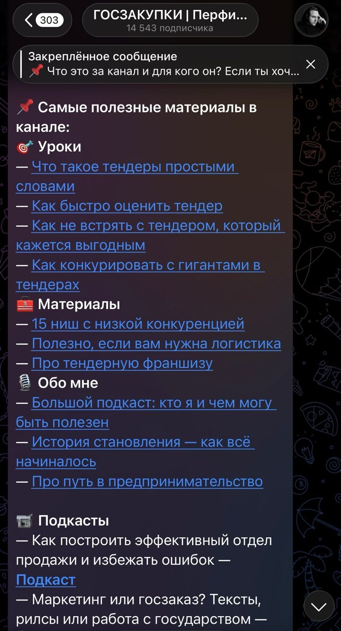 Здесь полезных материалов в разы больше, в одном из закрепленных постов Александр публикует ссылки на посты с важной информацией. В отдельном видео Перфильев рассказывает о своем пути в предпринимательстве и первом опыте работы с тендерами.