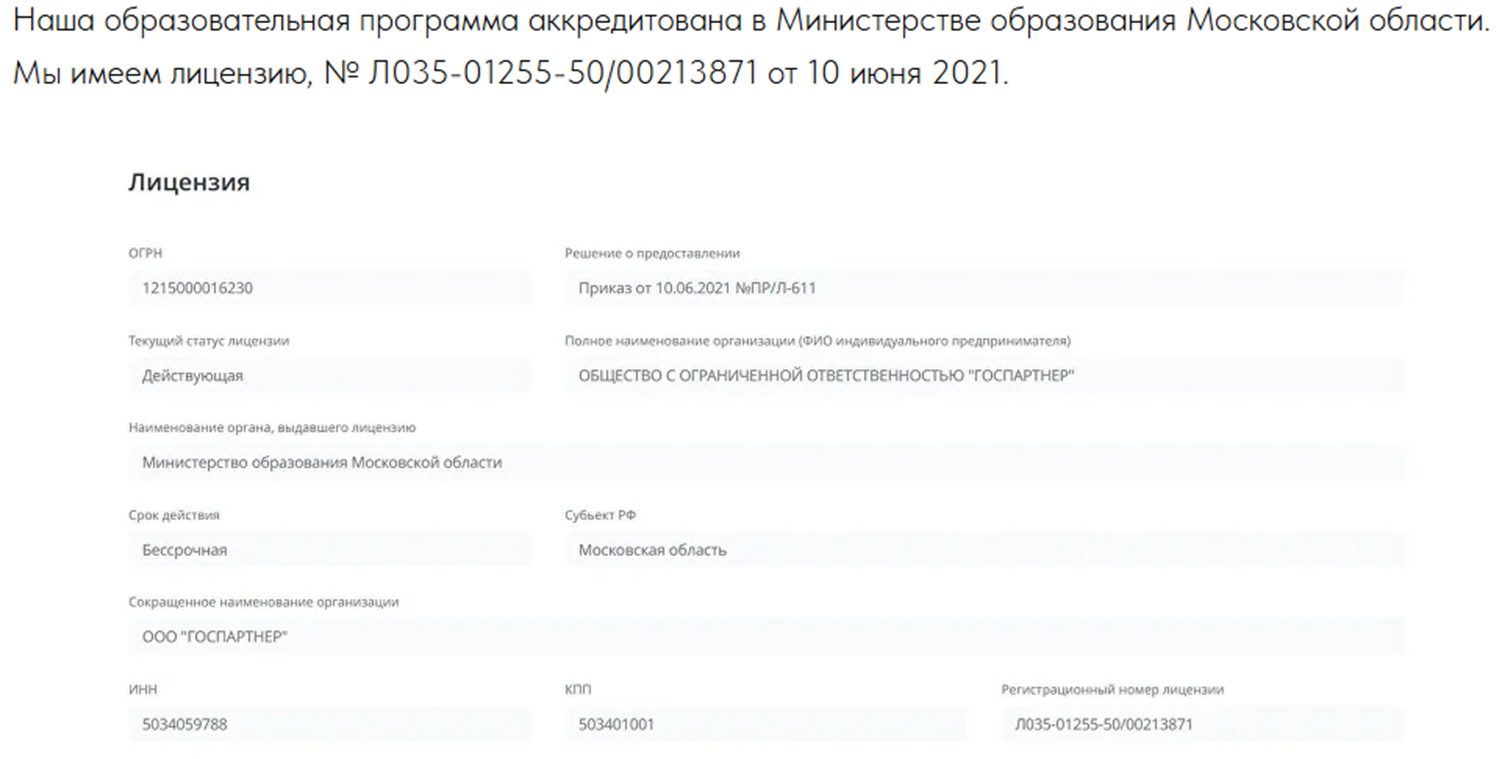 Услуги оказывают от лица ООО «Госпартнер» и ИП Перфильева Александра Сергеевича. Школа имеет лицензию от Министерства образования Московской области, скан документа есть на сайте.