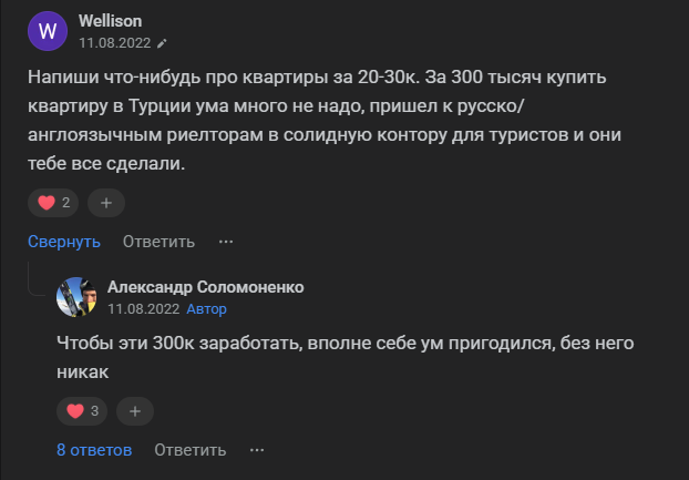 Вторая запись уже более интересная, к тому же она набрала почти 7 тыс. просмотров. Здесь Соломоненко рассказывает о покупке квартиры в Турции и пытается аргументировать это решение. Никаких реальных подтверждений владения объектом тут, конечно, не приложено. Да и выглядит все это так, будто купленная недвижимость является единственной инвестицией человека.