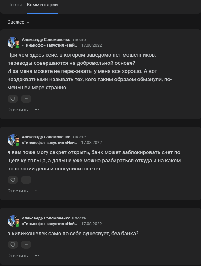 Сейчас на аккаунте всего две публикации. В августе 2022-го года Александр сначала прокомментировал обещания известного банка вернуть SWIFT-переводы. Никаких особых навыков или знаний в посте не продемонстрировано: блогер просто высказался о компании негативно, поскольку та не выполнила то, о чем заявляла.