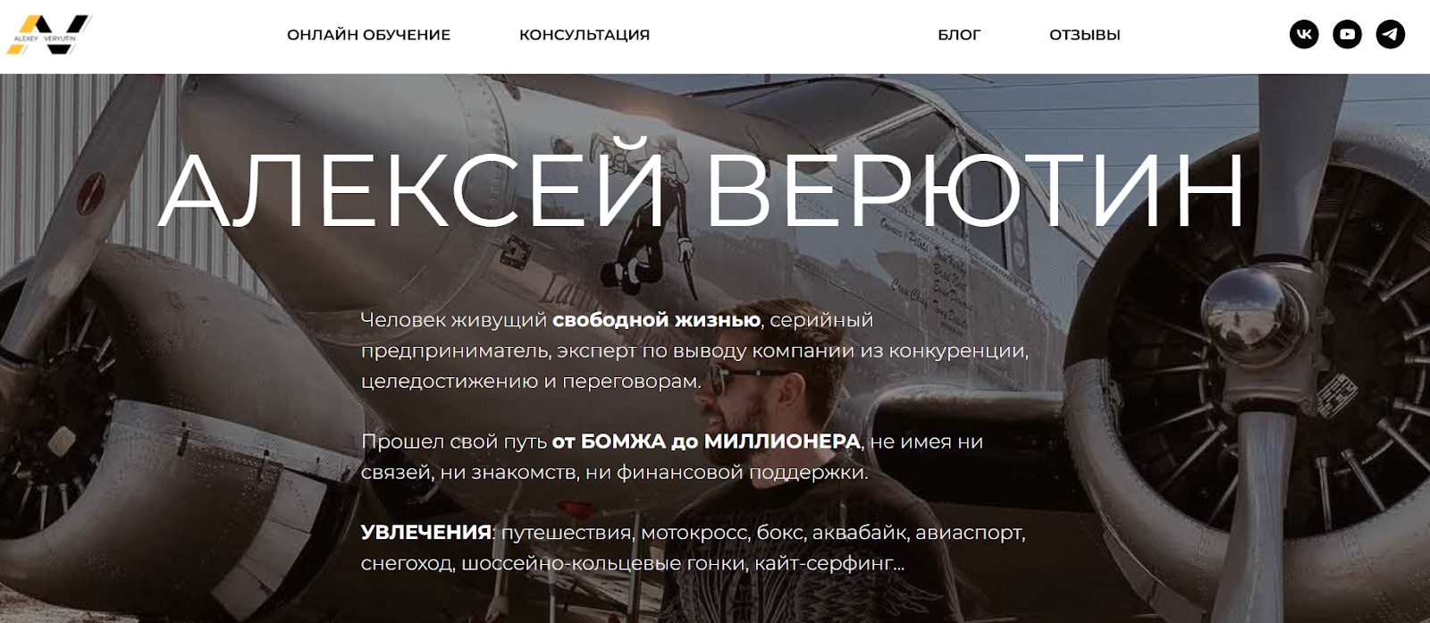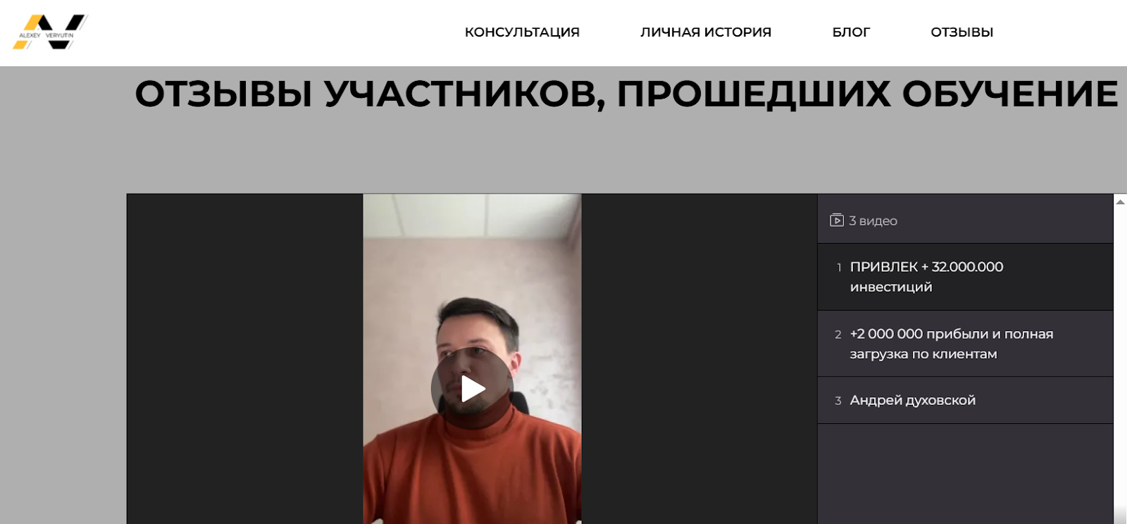 На своем сайте Алексей Верютин публикует отзывы от якобы довольных клиентов в формате видео. Участники на них благодарят его за наставничество и рассказывают свои истории развития и улучшения материальной жизни, бизнеса и карьеры.