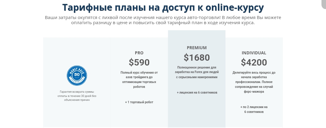Продукт позиционируется как комплексное обучение для платформы MetaTrader 4 и набор лицензий на торговых ботов-советников. Человек покупает курс «Авто-торговля на Форекс», получает набор видеоуроков, шаблоны, настройку VPS и пожизненные обновления роботов. Цены на работов от Алексея Седых варьируются от $590 до $4,200 и зависят от количества экспертов и объема консультаций.