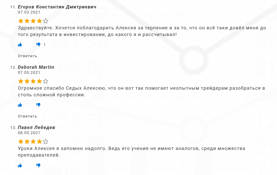 Комментарии об Алексее Седых в на первый взгляд восторженные: автора благодарят за «доход без усилий», хвалят подробные уроки и быструю поддержку. Однако нет ни одного отзыва с реальными выписками со счета, а упоминание просадок чаще всего завершается фразами о том, что потерянное удалось отбить быстро.
