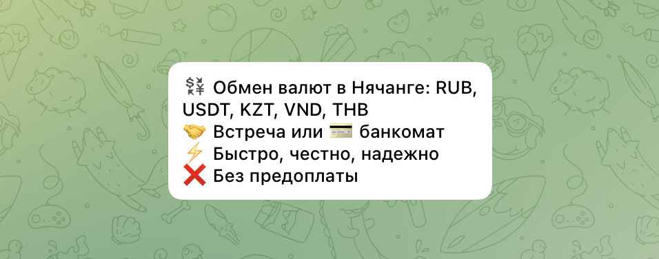 В описании страницы Alex Exchange bot в telegram, как видно по скриншоту вверху, автор указал возможность обмена разных фиатных валют — RUB, KZT, USD, USDT в Нячанг. Пользователи могут использовать платформу для конвертации таких активов, как юани, тенге, доллары, рубли. Из цифровых инструментов доступны только электронные аналоги — USDT. При этом важно учитывать, что комиссия за конвертацию таких валют зависит от сети.