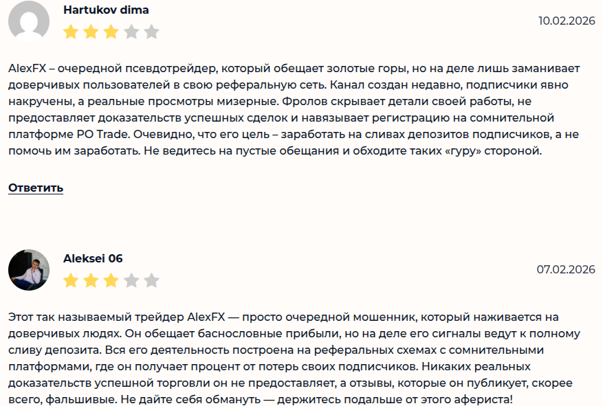 В негативных отзывах о платформе Alex Exchange bot бывшие трейдеры пишут, что команда — мошенники. Менеджеры требуют оплату выдуманных комиссий, из-за чего пользователи потом остаются ни с чем.