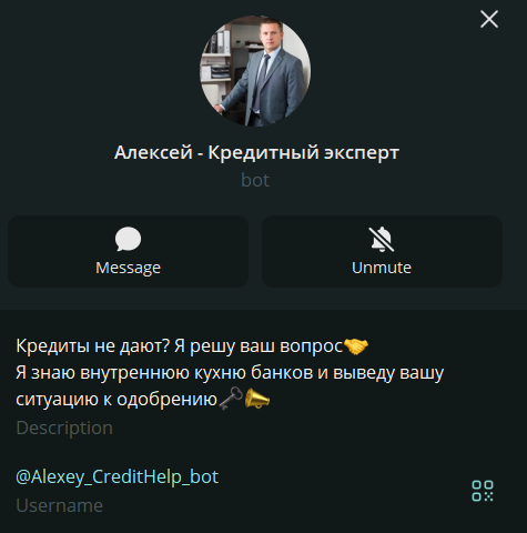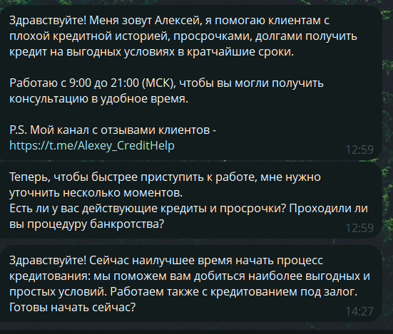 Alexey Credithelp Bot — это телеграмм-бот, который обещает помочь в решении любых проблем кредитования. Его автор утверждает, что хорошо знаком со внутренней кухней банков и является профессиональным финансистом. Он предлагает свою помощь в случае, если клиенту по какой-то причине отказали в выдаче кредита.
