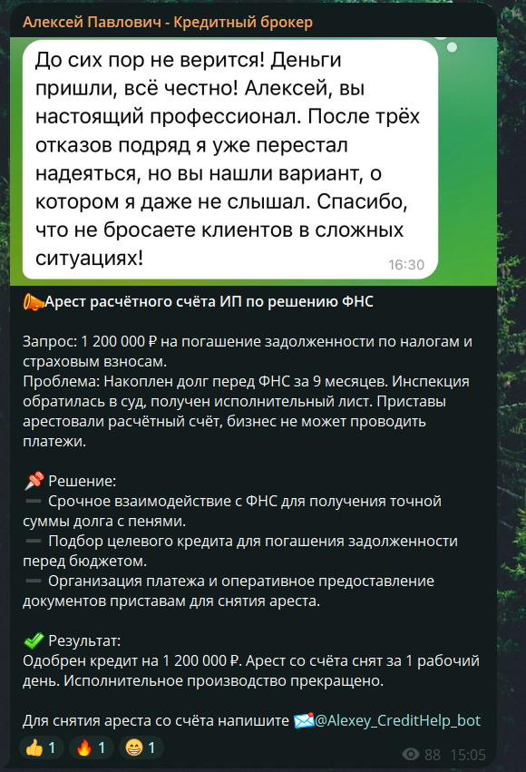 На независимых ресурсах отзывов о проекте Алексей Кредитный Эксперт нет. Можно только ознакомиться с положительными оценками в телеграмм-канале, который специально отведен под фидбек. Само собой, Алексей полностью контролирует контент в нем. Поэтому здесь можно встретить отзывы только довольных клиентов.