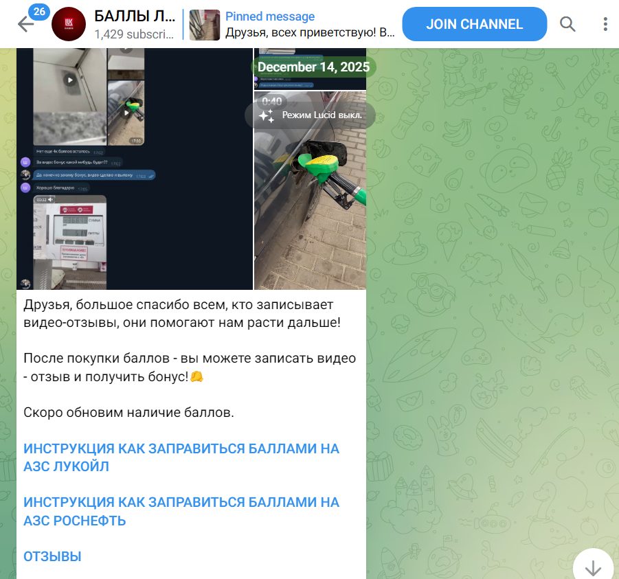 Канал Баллы Лукойл Роснефть открытый, ведется с 2025 года, и здесь более 1.4k юзеров. Активность в Телеграмм канале Lukoylball хорошая, и просмотры могут достигать 3k.