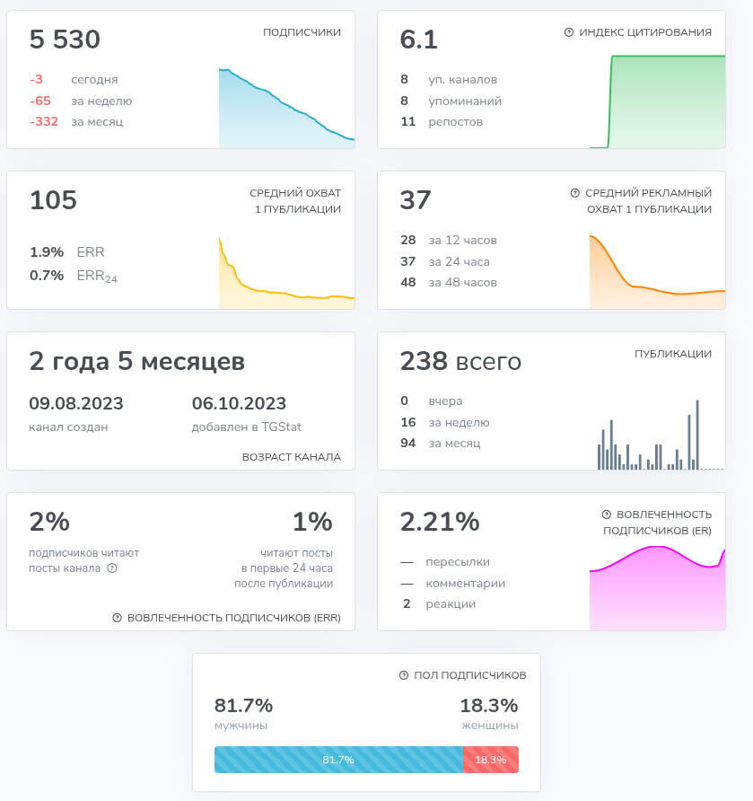 Ежемесячно от канала отписывается по 300-400 человек. Вовлеченность аудитории крайне низкая — всего 2.2%, и лишь 2% вообще читают посты Алекса. Индекс цитирования тоже маленький — всего 6.1, причем охват одной рекламной публикации всего 37, что провалено для любой маркетинговой кампании.