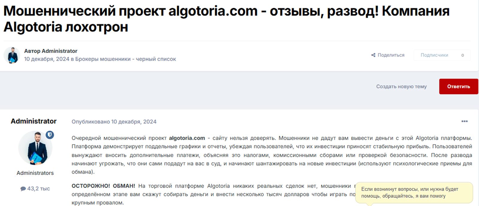 Но самое интересное, что на некоторых обзорных сайтах Algotoria фигурирует как скам. И админы не рекомендуют с ним связываться.