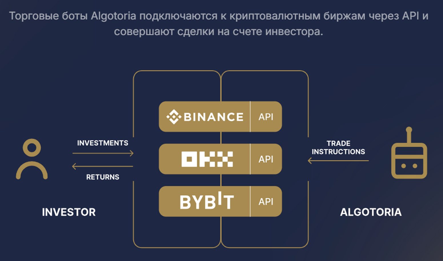 Algotoria Crypto Trading – автоматизированный софт, который позволяет торговать криптой на известных криптобиржах. На сайте сказано, что возможно подключение к API Binance, OKX и Bybit. То есть инвестор подключает бота к своему аккаунту, а тот самостоятельно заключает сделки.