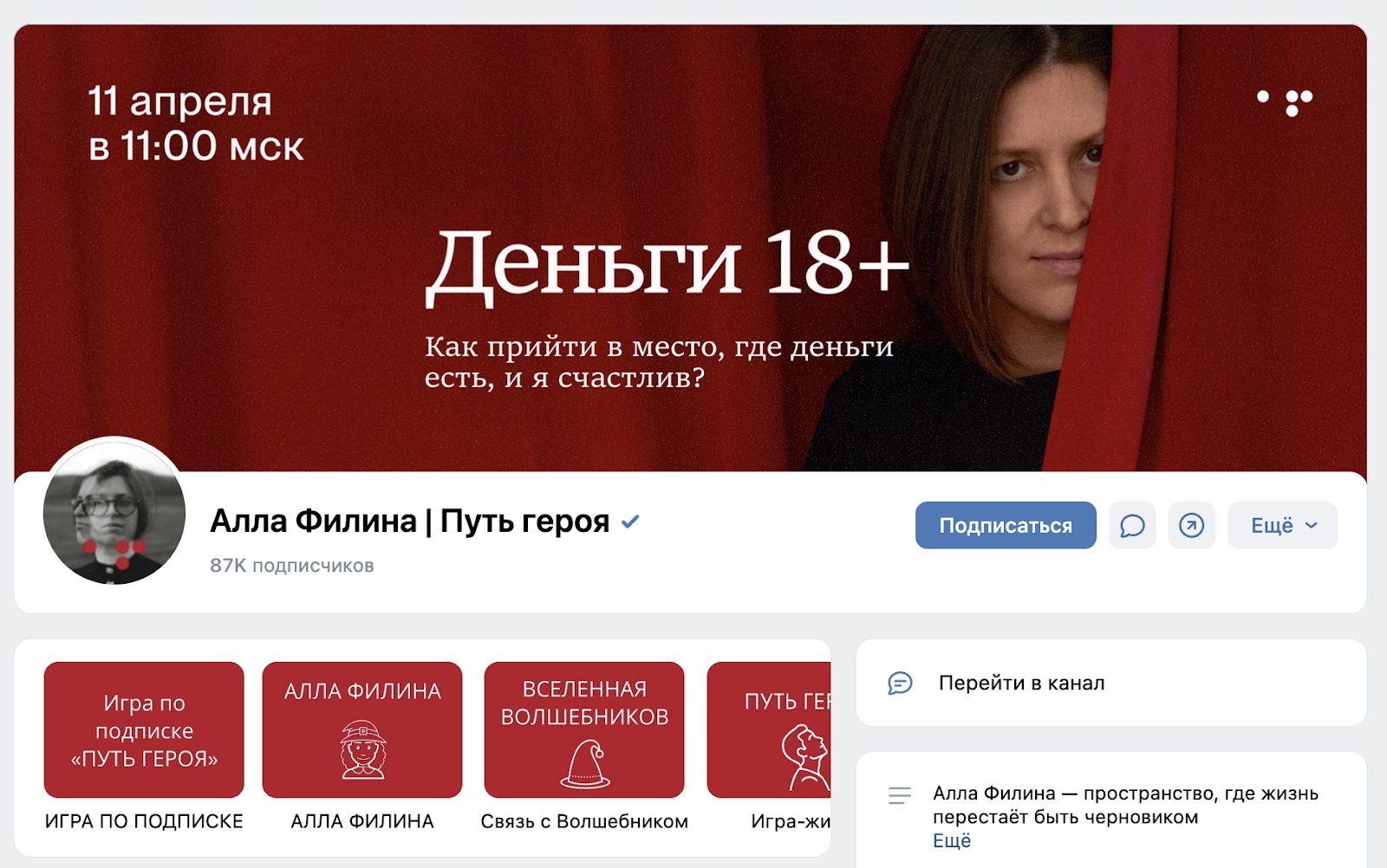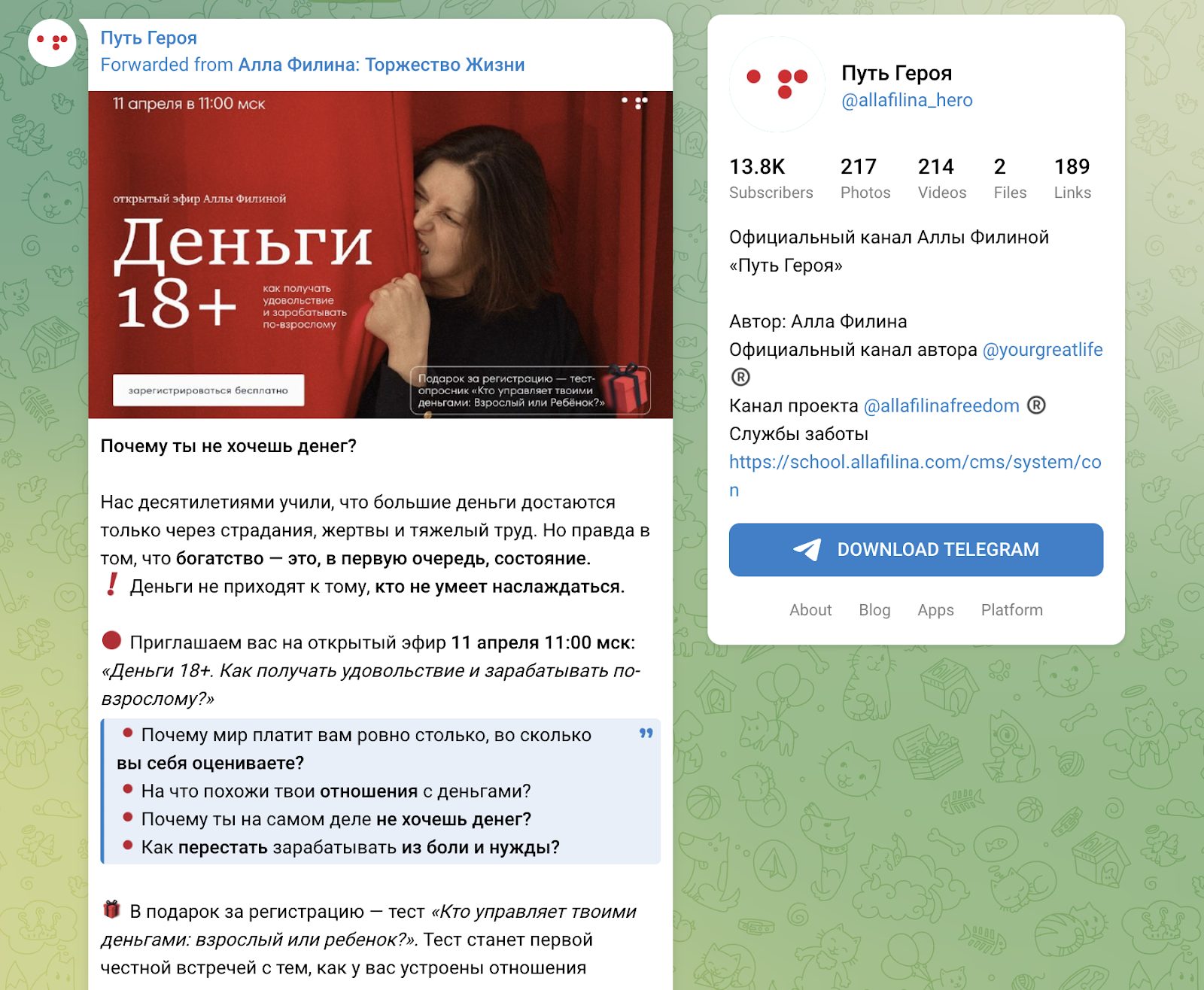 Телеграм канал Алла Филина Деньги по Любви выступает центральной точкой прогрева и удержания аудитории. Через него регулярно подается контент в стиле размышлений, разборов, кейсов участников и смысловых постов про деньги, ответственность и личные границы. В этой связке канал работает как вход в воронку, где далее пользователю предлагают уже платные форматы.