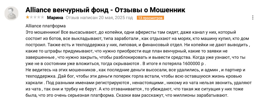 Отзывы о венчурном фонде «Альянс» — это сообщения от людей, которые потеряли деньги в результате инвестирования на данной платформе. Они, как и Марина, заявляли, что организаторы проекта развели их на деньги.