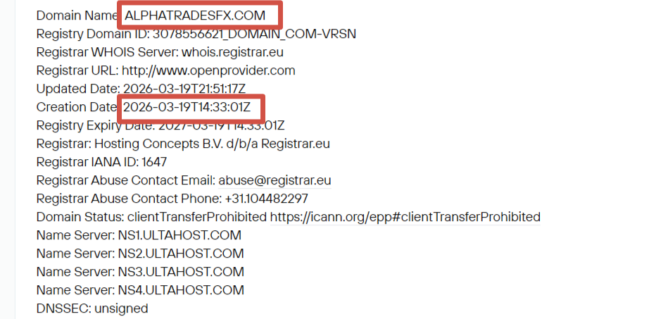 Официальный сайт фирмы содержит основные сведения о брокере и способы связи. Здесь же можно зарегистрироваться. Впрочем, первая проверка выявила недобросовестность платформы. Домен alphatradesfx com создан меньше месяца назад. Это опровергает утверждение о многолетнем опыте.