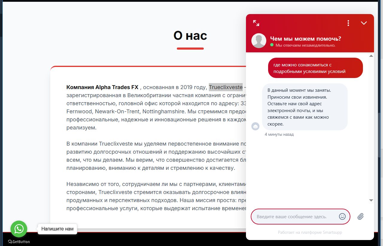 На сайте нет никаких сведений о финансовых условиях сотрудничества. Неизвестно какая минимальная сумма для входа, какой размер комиссии. Прямой вопрос в онлайн-чате проигнорировали и предложили оставить контакты для связи. Это говорит о том, что владельцам просто нужно получить данные пользователя. Потом менеджеры смогут связаться с пользователем и уговорить зарегистрироваться.