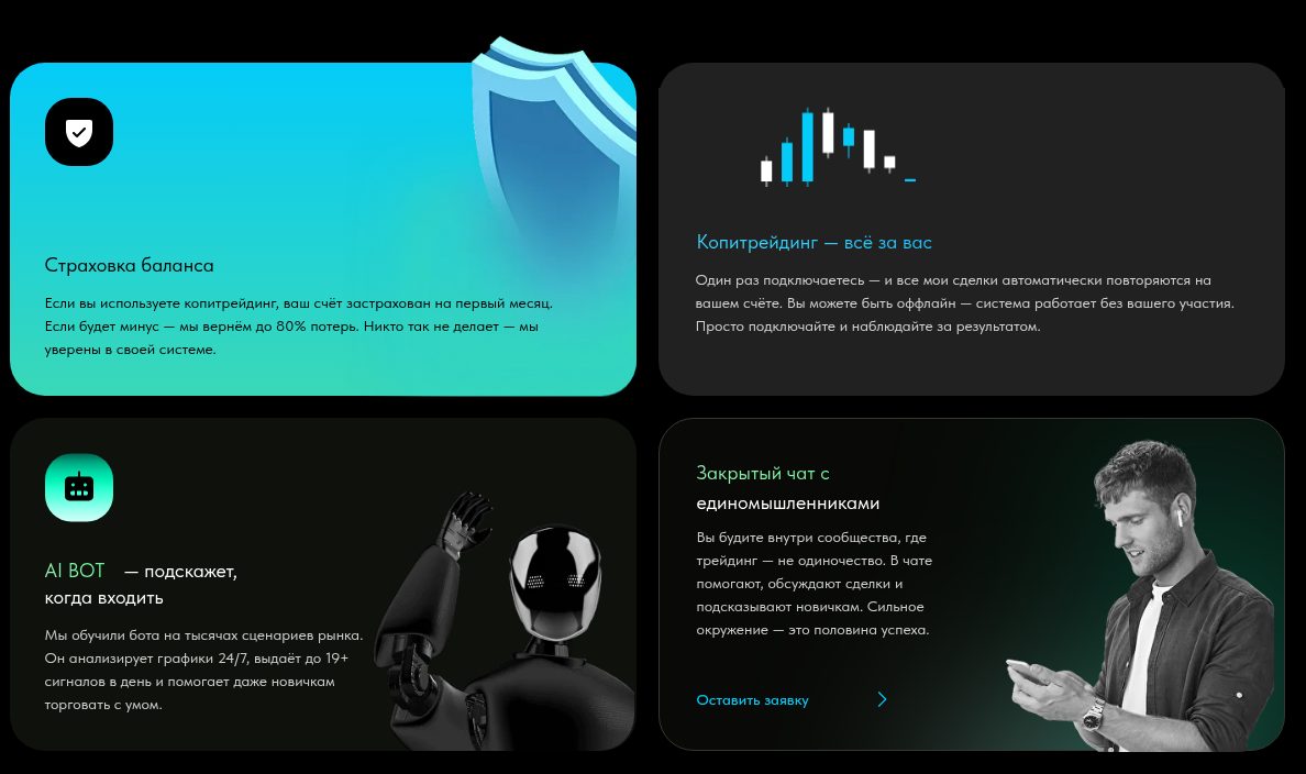 Набор звучит привлекательно. Бот за 4 500 долларов в месяц — сумма приличная, но как верифицировать его эффективность, непонятно. Реального торгового трека в открытом доступе нет. Гарантия возврата депозита при сливе — юридически неоформленное обещание, и выполнять его или нет, решает сам администратор.