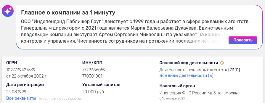 ИНН и ОГРН, опубликованные в подвале, принадлежат ООО Индепендэнд Паблишер Груп, которое ведет деятельность рекламных агентств. Какое отношение эта компания имеет к трейдингу, неизвестно. Возможно, эти данные просто украдены.