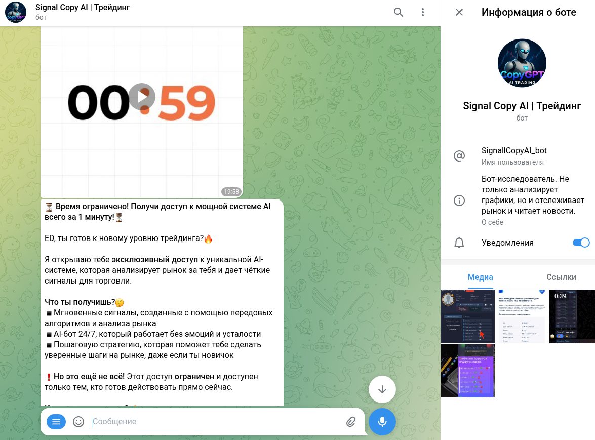 Работает по ссылке @SignallCopyAI_bot. После запуска бот предлагает эксклюзивный доступ к AI-системе с характерными формулировками: Время ограничено!, Получи доступ за 1 минуту, Этот момент может стать поворотным. Это классический прием создания искусственного дефицита — работает на базовой психологии, отключает критическое мышление и вынуждает действовать быстро.