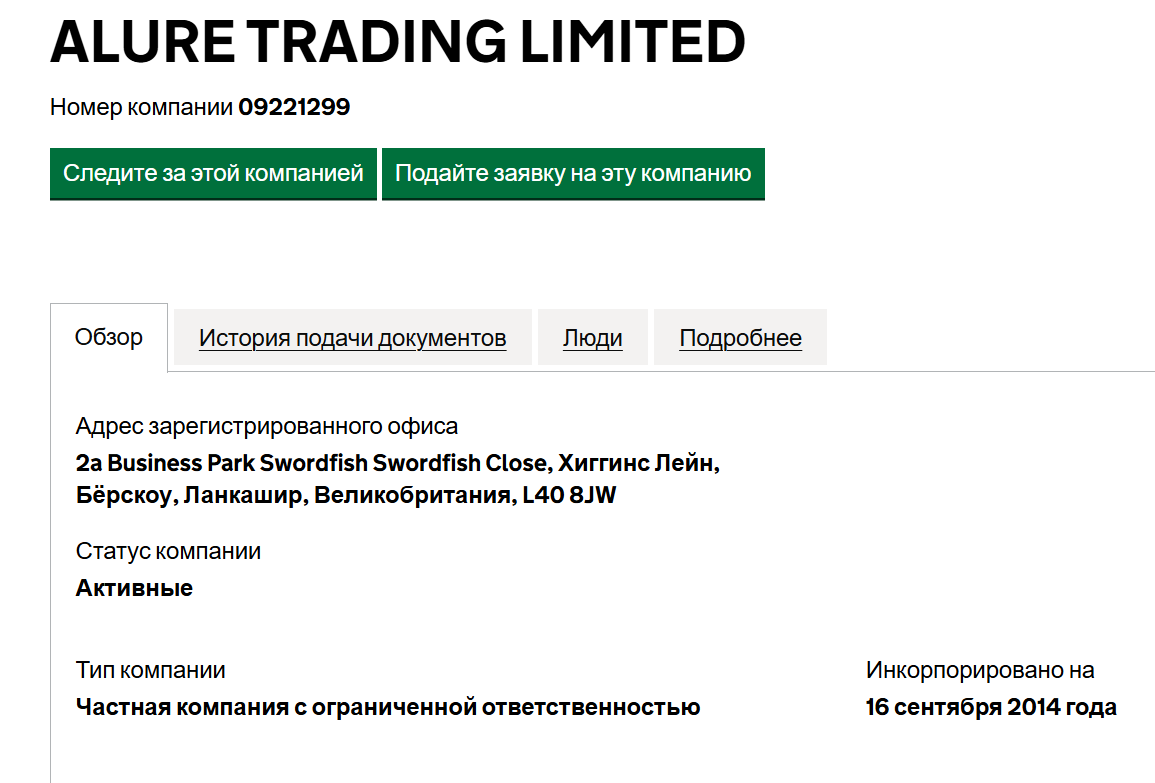 Компания AlureTrading якобы зарегистрирована в Великобритании. На сайте указано, что она основана в 2014 году. Головной офис находится в Ланкашире, а филиалы расположены в: