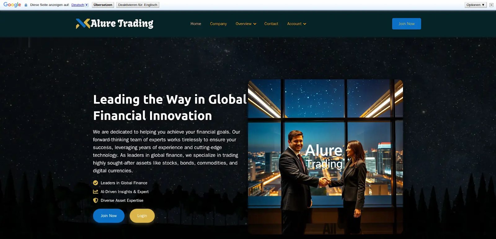 Alure Trading – это онлайн-платформа для инвестиций и трейдинга. Она представлена создателями как глобальный лидер в управлении активами. Сайт предлагает торговать и зарабатывать на акциях, облигациях, сырьевых товарах и других активах. После регистрации якобы доступна даже сфера возобновляемой энергии. Однако на март 2026 года площадка прекратила функционировать. Возможно, компания «переехала» на другой адрес или вовсе была закрыта.