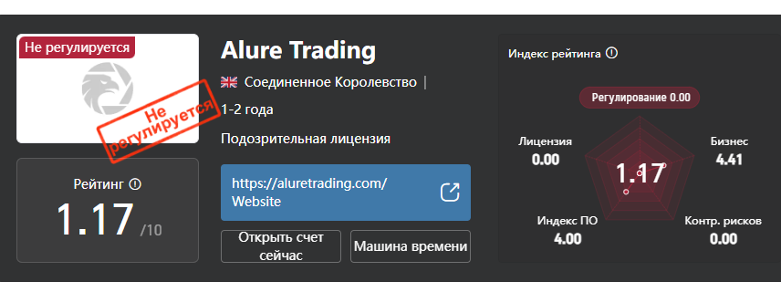 Репутация AlureTrading на март 2026 года негативная. Как таковых развернутых и подробных отзывов с примерами нет, но независимые ресурсы демонстрируют рейтинг доверия – и он низкий.