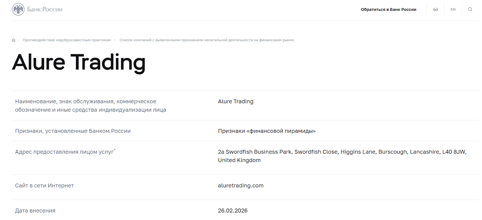 В феврале 2026 Банк России включил Alure Trading в список организаций с признаками финансовой пирамиды. Ранее аналогичное предупреждение выпустила испанская CNMV, указав компанию среди незарегистрированных поставщиков инвестиционных услуг. FCA сохраняет своё предупреждение от июня 2025 – фирма по-прежнему не авторизована и классифицируется как потенциально мошенническая.