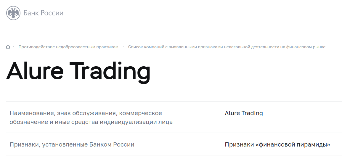 На главной странице сайта написано про использование ИИ, персонализированные стратегии от команды экспертов и наличие образовательных ресурсов, но ничего из этого не подтверждено. Более того, проект вообще заблокирован РКН, а ЦБ РФ внес его в черный список, поэтому можно с уверенностью сказать, что деятельность платформы Alure Trading никем не регулируется, а это вызывает серьезные сомнения в порядочности создателей.