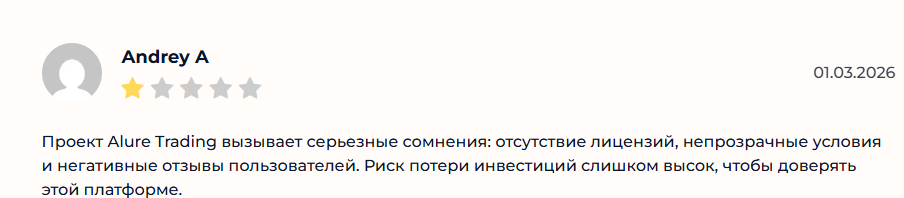 • В отзывах об Alure Trading пользователи высказывают сомнения по поводу надежности платформы, а позитивных комментариев вообще нет, что говорит о плохой репутации.