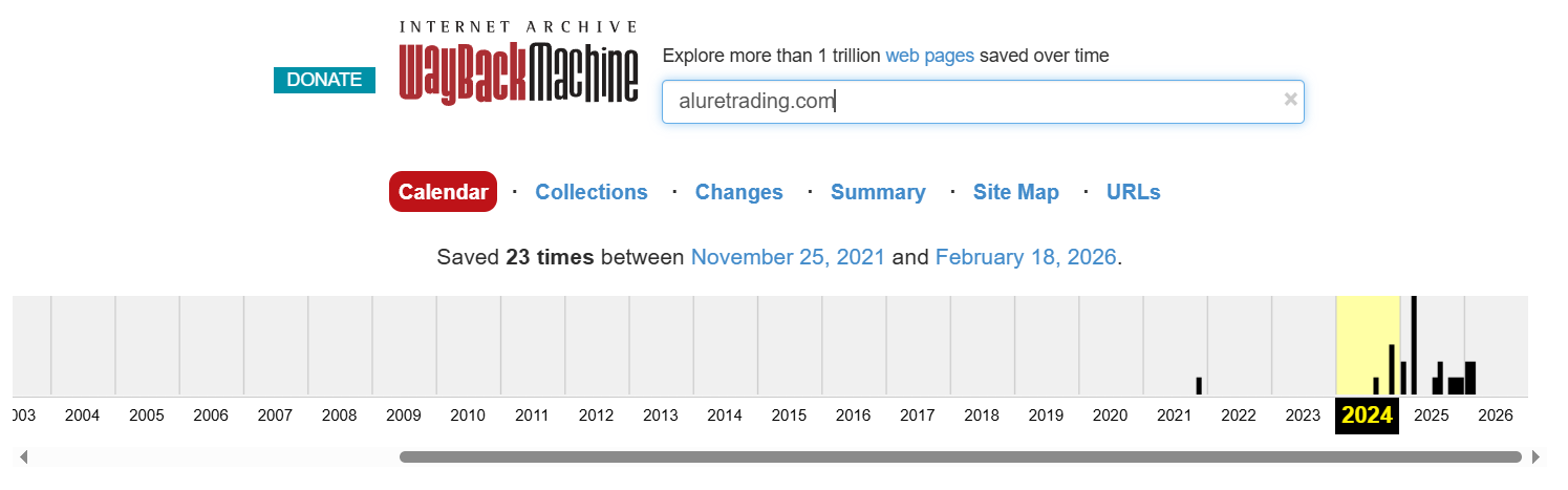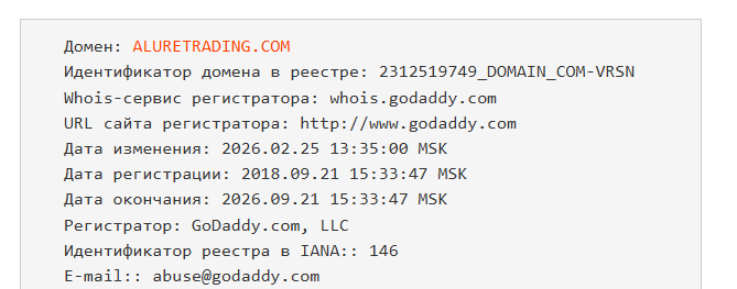 Судя по информации с аналитического сервиса, домен AlureTrading com зарегистрировали в 2018 году, что может говорить о продолжительном сроке работы.