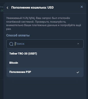 С целью узнать о том, какие платежные методы поддерживает система, наша редакция зарегистрировалась на площадке. В итоге мы выяснили, что в списке доступных способов внесения средств присутствует P2P.