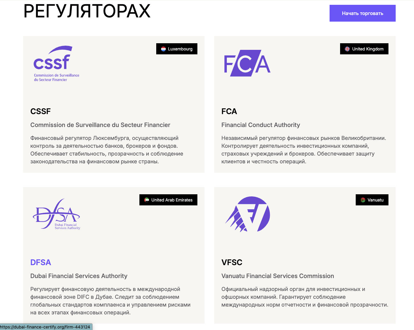 С регулированием деятельности организации тоже все не в порядке. В разделе «Лицензии» перечислены наименование финансовых учреждений и их описания. Там же представлены ссылки на сайты регуляторов, где можно верифицировать документы.