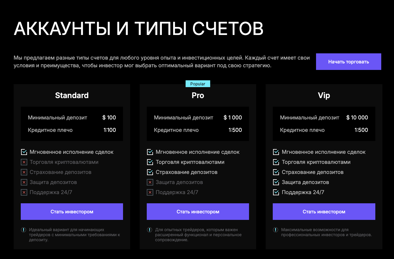 - для внесения средств доступны только криптокошельки — показывает, что владельцы брокера хотят сохранить анонимность.