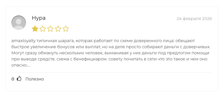 В единственном ревью, которые удалось найти, заявлено, что AmaxLoyalty — «типичная шарага», скам и лохотрон. Этот фидбэк является дополнительным подтверждением тем признакам мошенничества, о которых мы написали выше.