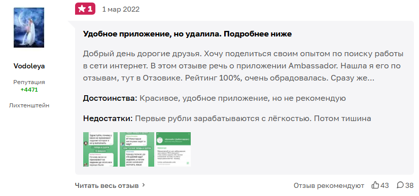 На портале «Отзовик» можно найти немало положительных отзывов о проекте Ambassador. В них люди хвалят сервис за простые задания, понятный интерфейс и, по их словам, неплохую оплату за выполненную работу.