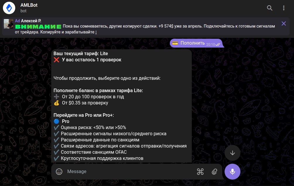 Стоимость за 1 проверку через AmlSecurebot io — от 0.35 доллара. Цена зависит от варианта пакета. Для заработка есть реферальная программа, но деталей насчет нее в открытом доступе нет. Чтобы получить по ней больше информации, необходимо обратиться в техническую поддержку amlbot_support_bot.