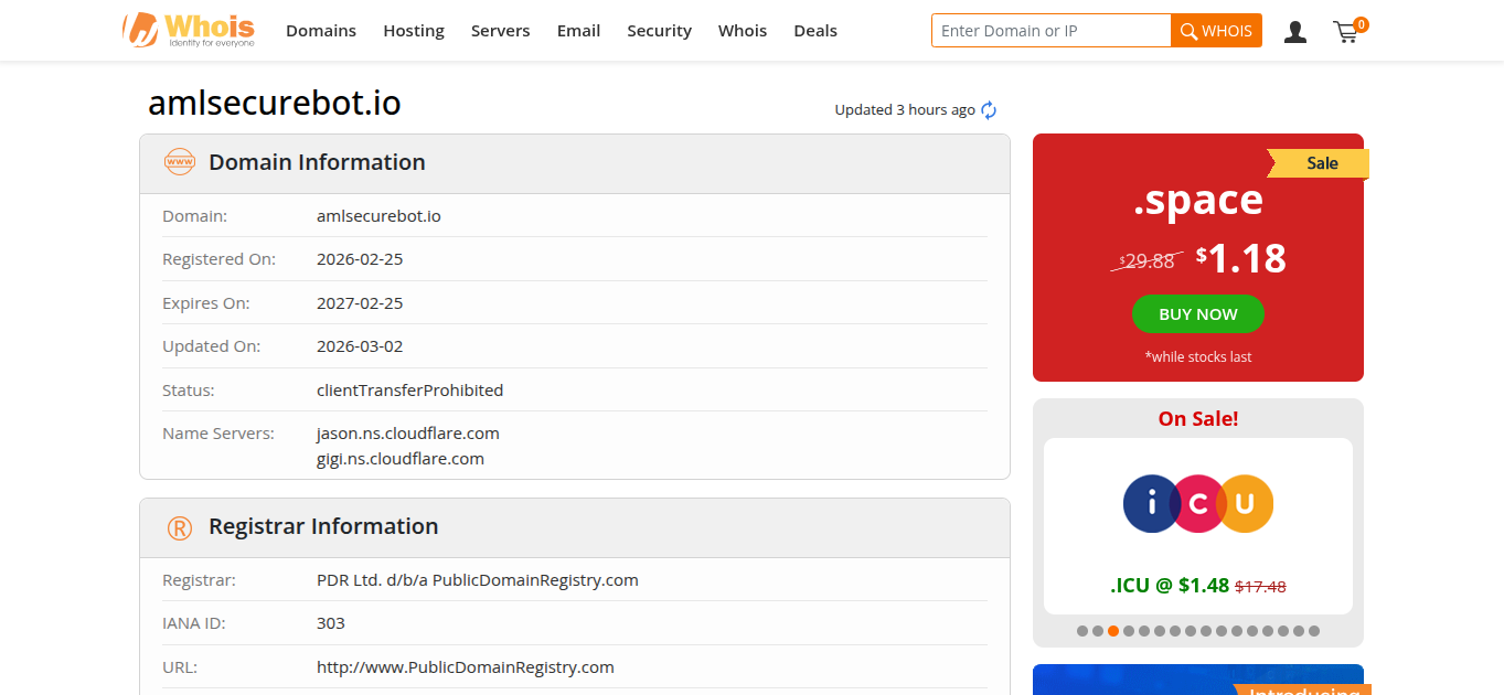 Единственное, что мы смогли узнать по сайту — дату его запуска. Через WHOIS наша редакция выяснила, что проект работал с 02.03.2026 года. Платформе по анализу сделок AmlSecurebot io в лучшем случае чуть больше месяца и за все время проект так и не получил фидбеков.