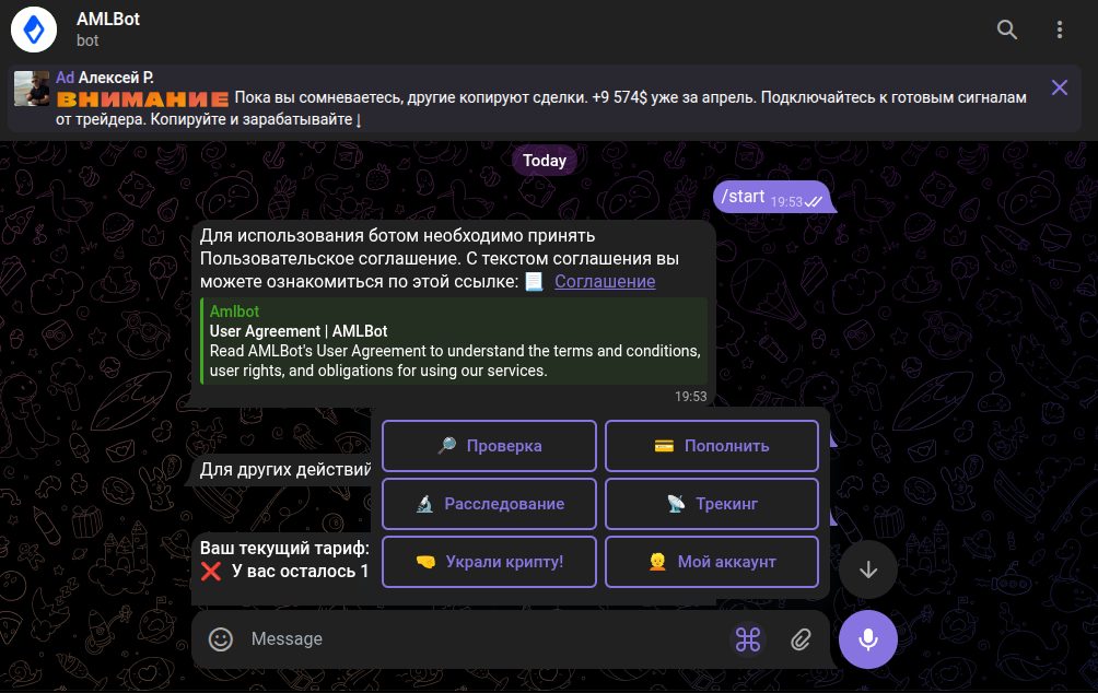 Наша редакция сразу проверила бот в телеграме. Итак, чтобы «пробить» криптовалюту или кошелек, надо открыть бот cryptoaml bot. Далее необходимо нажать /start и получить личный кабинет. Стоит отметить, приветственного сообщения нет и система сразу открывает перед пользователем блок с соглашением. Его надо прочитать и принять, иначе инструментарий AmlSecurebot io клиент не получит.
