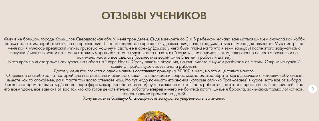 Фидбэки участников есть на сайте самой Анастасии. Их немного и все они положительные – ученицы хвалят четкую структуру курса, практическую направленность материалов и качественную поддержку. Также они пишут, что курс Анастасии дал им быстрый вход в профессию – мол, люди по 5 лет учатся и выходят ни с чем, а тут – 3 недели и готово.