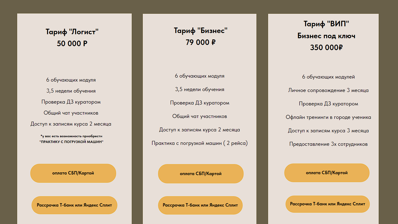 У курса «Транспортная компания с нуля» есть 3 тарифа – от 50 до 350к рублей. Самый дорогой включает 3 месяца личного сопровождения, офлайн-тренинги и предоставление трёх сотрудников. Доступ к материалам у ВИП-участников сохраняется три месяца.