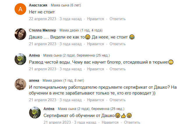 В независимых источниках такая наставница почти не упоминается. Есть единичные комментарии на форуме – кто-то спрашивает, стоит ли обучаться у Дашко, и ему отвечают, что нет. Видно, что репутация у специалистки сомнительная: люди открыто смеются над ней и припоминают тюрьму.