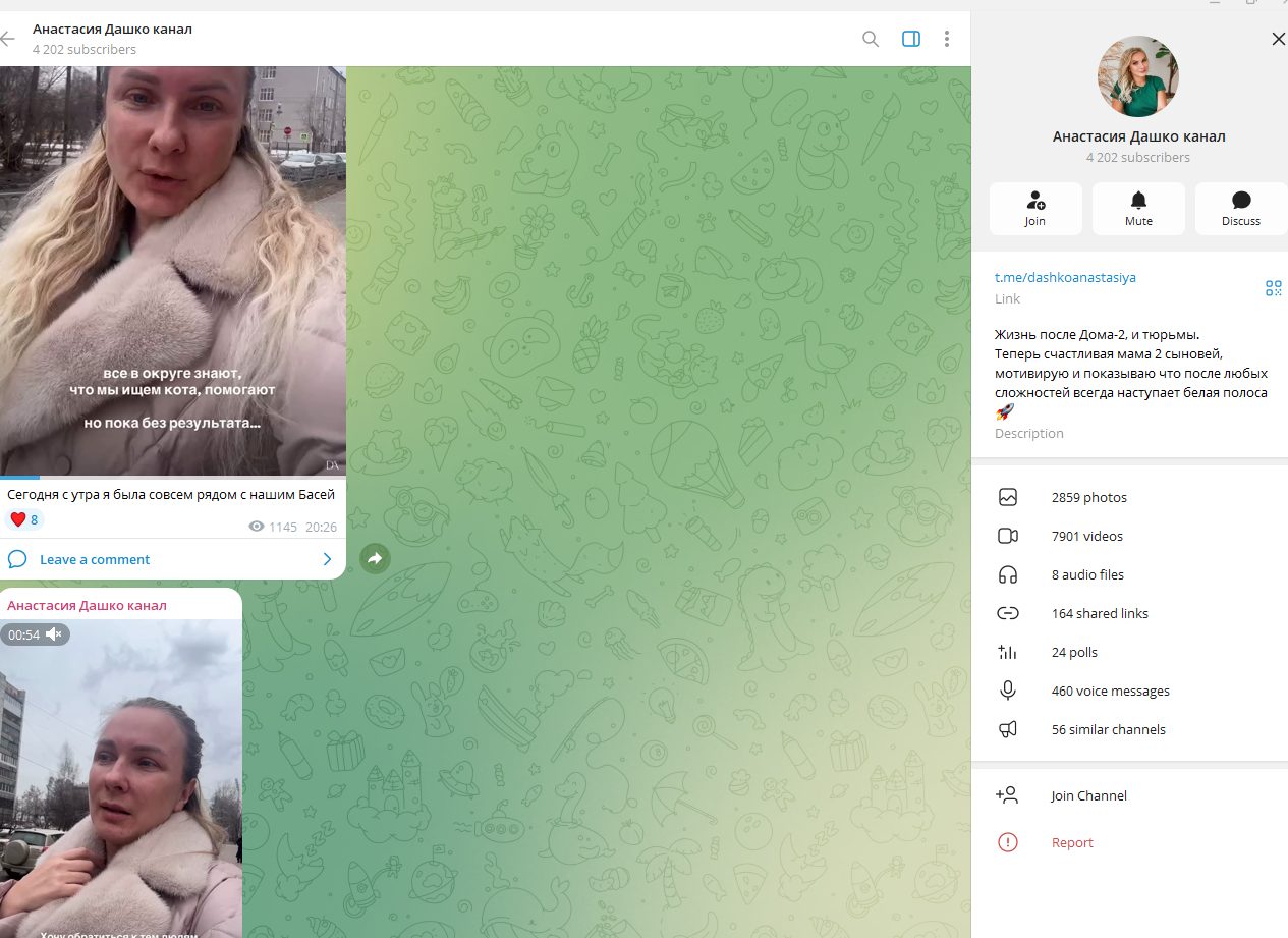 Еще у Дашко был «Телеграмм» dashkoanastasiya, но она забросила его в апреле и перешла в мессенджер «Макс». На канале было 4к подписчиков, в основном там публиковался фото- и видеоконтент: