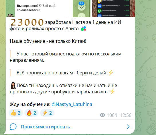 Анастасия Латухина предлагает курс по теме как зарабатывать на перепродажах с Китая. Ну и другие профессии затрагивает, например доход на ИИ. Но суть в том, что сама она получает основной доход не с этих профессий , а продажи как куратор этих курсов. Вернее доступа к ним. Не так все просто как они там нам расписывают. Сестра брала себе для выгодных покупок. Но выгоды кроме трат не получила