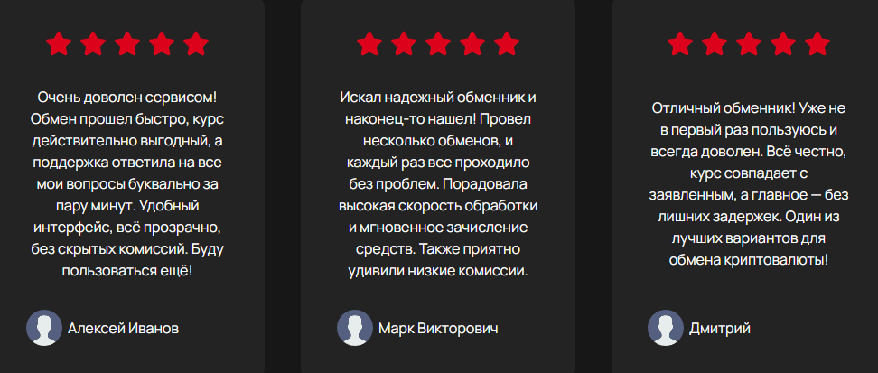 Единственные комментарии – на самом сайте. Три восторженных отзыва выглядят фейково. Люди пишут про выгодные курсы, быструю поддержку, низкие комиссии и честность. Шаблонные фразы без конкретики. Даты публикации отсутствуют. Проверить авторов невозможно.