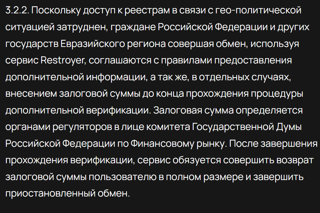 Пункт про залоги особенно подозрительный. Граждан РФ при проверке могут обязать внести залог. Размер определяет «комитет Госдумы по финансовому рынку». После верификации обещают вернуть. Но этот комитет не регулирует обменники, особенно такие сомнительные. Это наглая ложь.