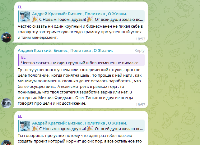 Также мы изучили обсуждения подписчиков под постами в Telegram Андрея Краткого. Большинство комментариев – лояльные, видно, что аудитория поддерживает автора и благодарит за полезный контент.