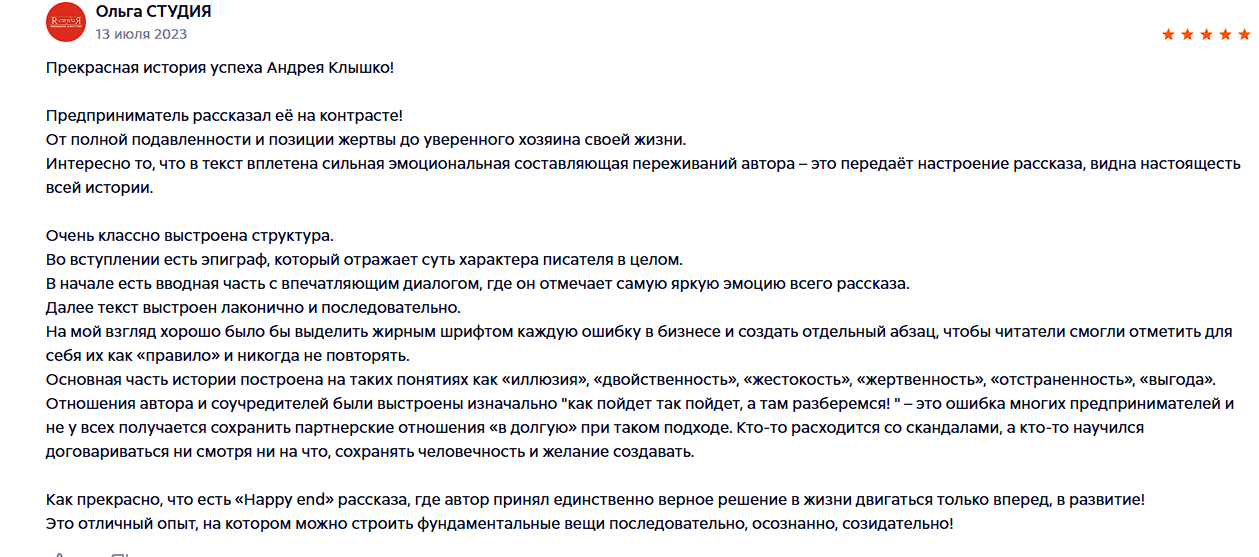 Тем не менее, свои поклонники у Андрея Краткого есть, некоторым людям нравятся его книги и образовательные посты. А вот с сотрудничеством ситуация неопределенная, отзывов партнеров нет, что, вероятно, связано с форматом его работы. Это не делает Петрова плохим или хорошим специалистом, но перед работой с ним обязательно нужно выяснить все условия и найти реальных клиентов.