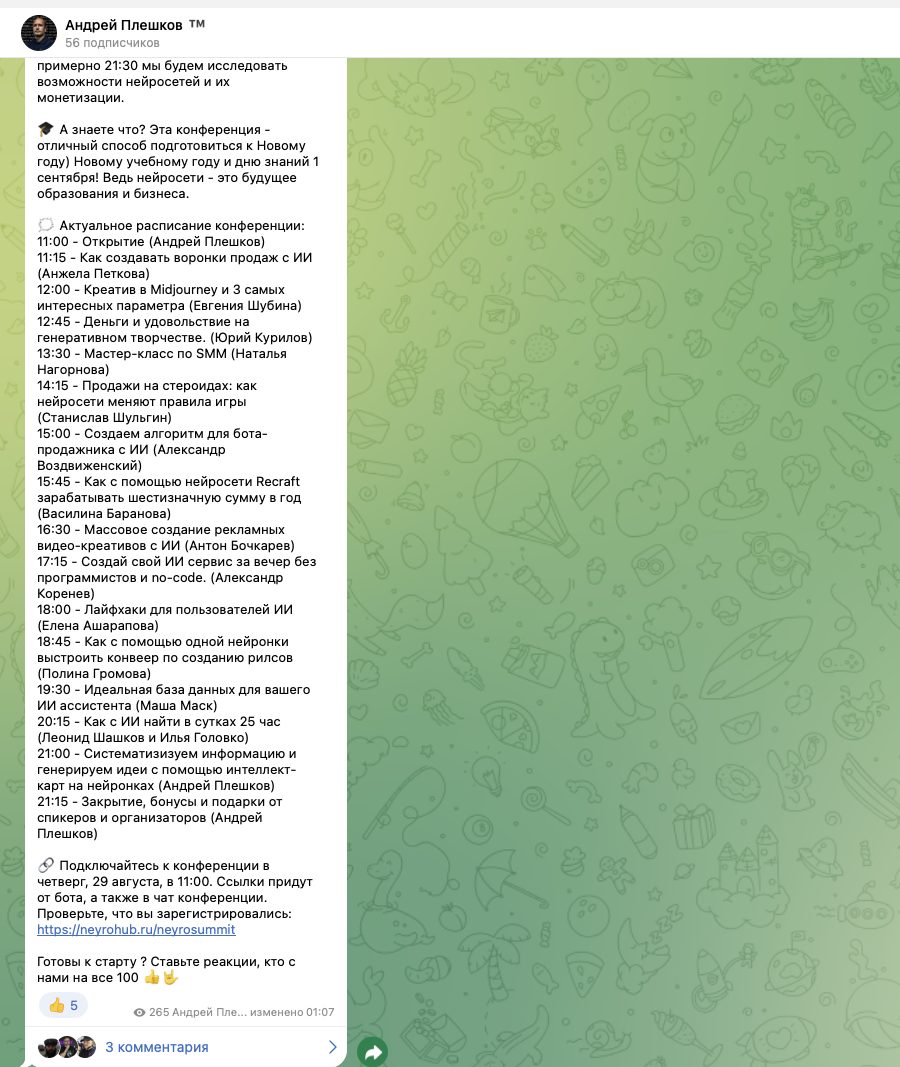 От лица этого же ИП работал другой проект – neyrohub ru. Но, по всей видимости, проект не получил должного внимания и был приостановлен. Последний раз на Телеграм-канале Андрей Плешков пост о том, что будет конференция на этой платформе, вышел 29 августа 2024 года: