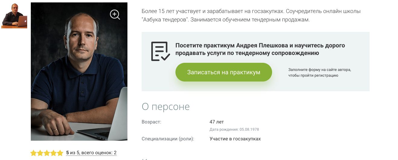 Основная деятельность автора связана с тендерными закупками. По информации на сайте ИнвестКурсы, автор работает в этой сфере с 2002 года.
