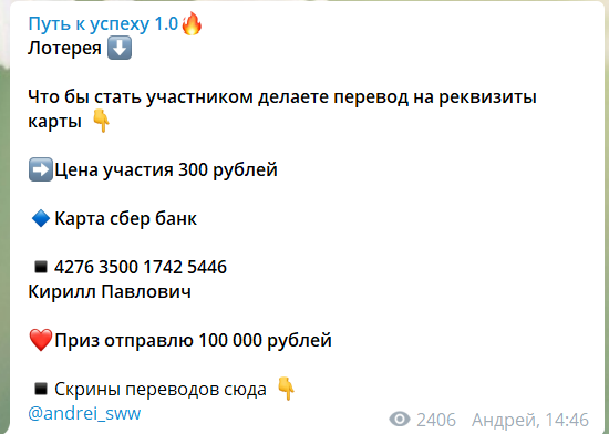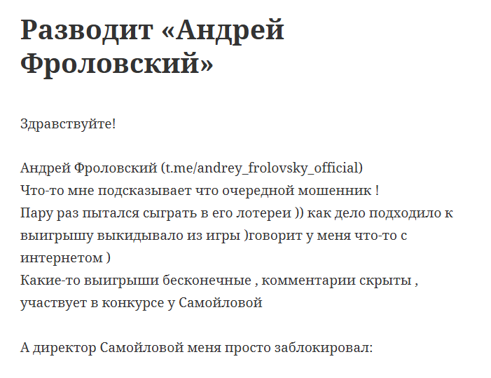 Андрей Фроловский – ник автора в Телеграм, предлагающего пользователям розыгрыши с раздачей денег. Автор заявляет, что готов помогать тем, кто в этом нуждается. При этом в сети есть отзывы, что Андрей Фроловский мошенник, создающий сообщества для развода аудитории на деньги. Мы провели проверку деятельности автора.